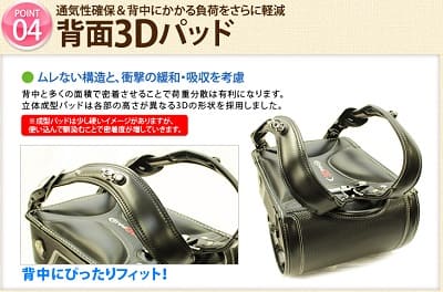 - 肩ベルトの付け根が2重構造になることで、肩ベルトは自然に立ち上がり体に密着するので、体が後ろに引っ張られないから軽い。